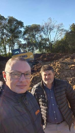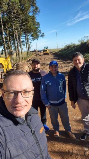 O prefeito Rosemar Hentges, o vice-prefeito Juberlan Giongo e o secretário de Obras, Everaldo Roque de Andrade, acompanharam de perto os trabalhos, reforçando o compromisso da gestão com as demandas do interior.