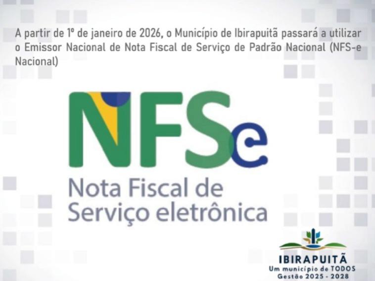 A administração pública, por meio da Secretaria da Fazenda e Setor de Tributos, informa à população ibirapuitanense que está sendo implantado no município o Sistema de emissão de Nota Fiscal de Serviço Eletrônica (NFS-e). O sistema é utilizado para emissão de Notas Fiscais de empresas e profissionais prestadores de serviços.