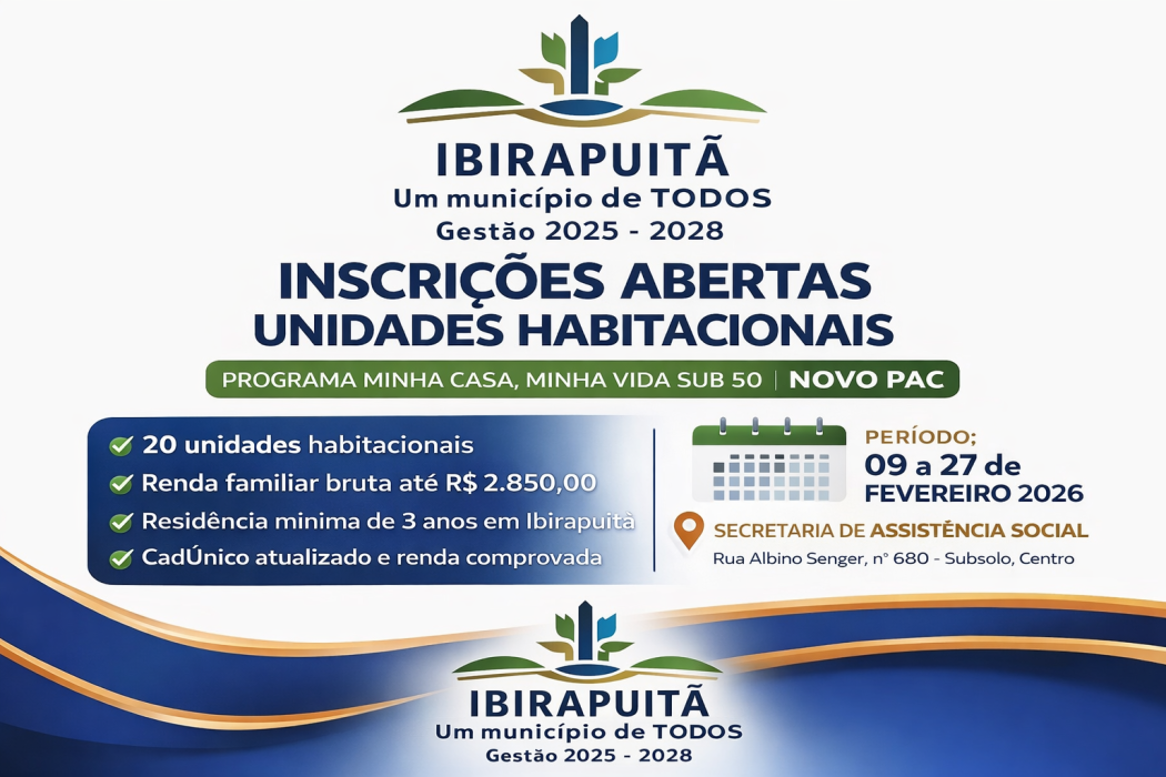 Conforme previsto no edital, podem participar do processo seletivo famílias que residam no município há, no mínimo, três anos, possuam renda familiar mensal bruta de até R$ 2.850,00, estejam inscritas no Cadastro Único (CadÚnico) e atendam aos demais requisitos legais.