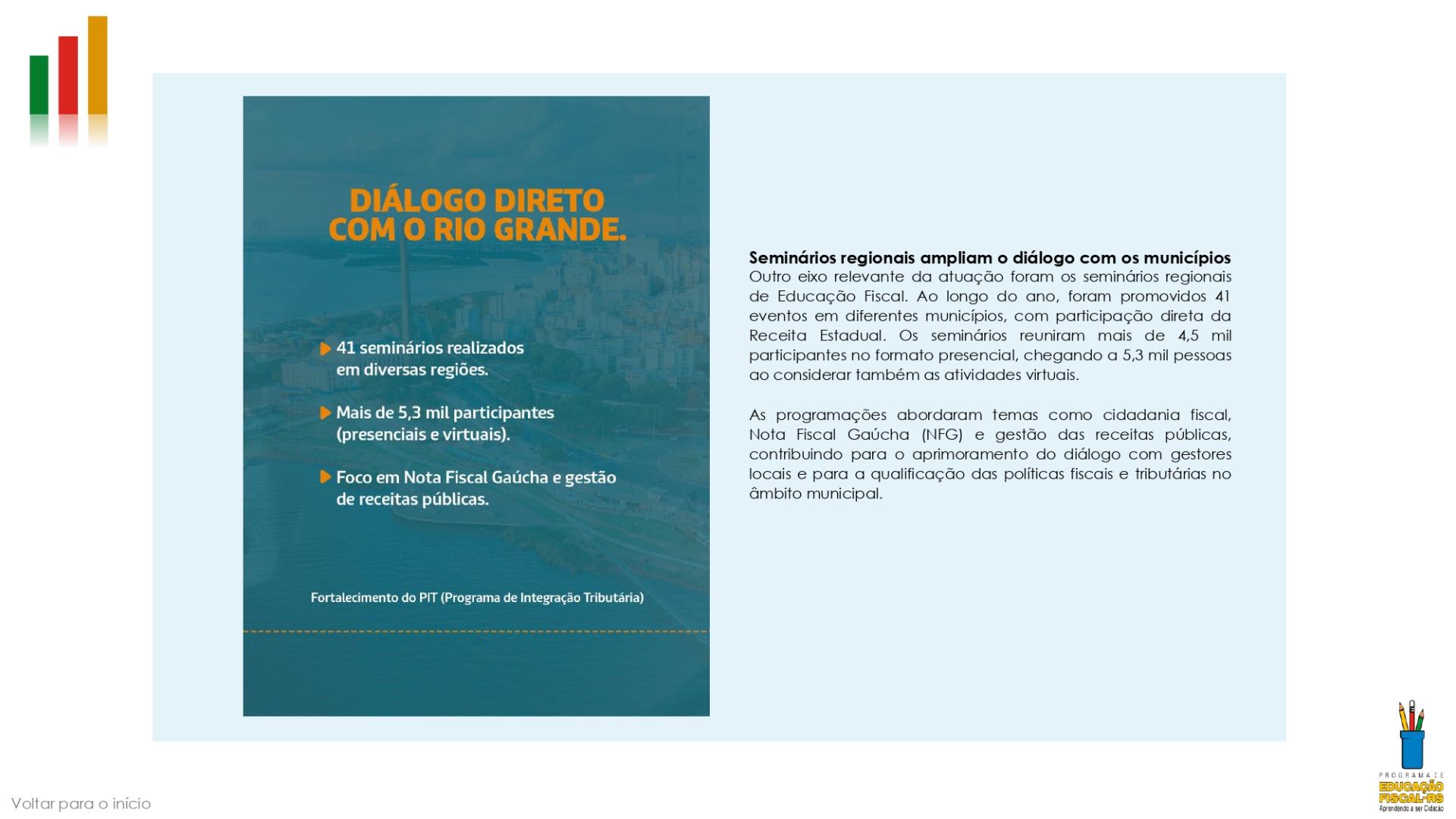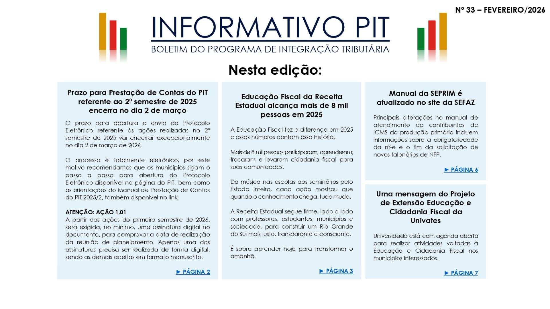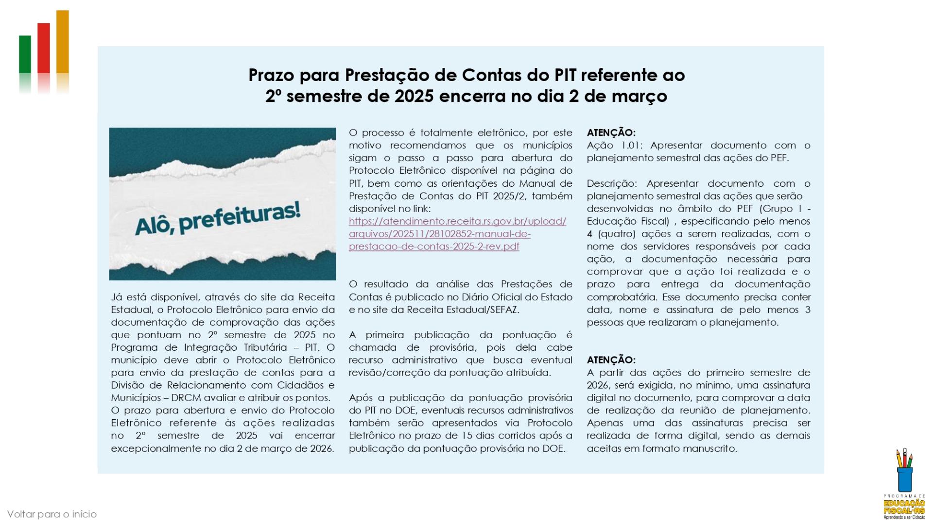 A divulgação deste INFORMATIVO PIT pontua na Ação 1.03 - Divulgar o PEF e suas ações e trabalhos em mídias digitais ou em mídias impressas, com comprovação por meio de cópias da divulgação do Grupo I – Educação Fiscal do PIT. O município que comprovar o envio do boletim aos seus servidores ou que divulgar o Informativo nas plataformas digitais da prefeitura pontuará com 3 pontos no PIT deste semestre.